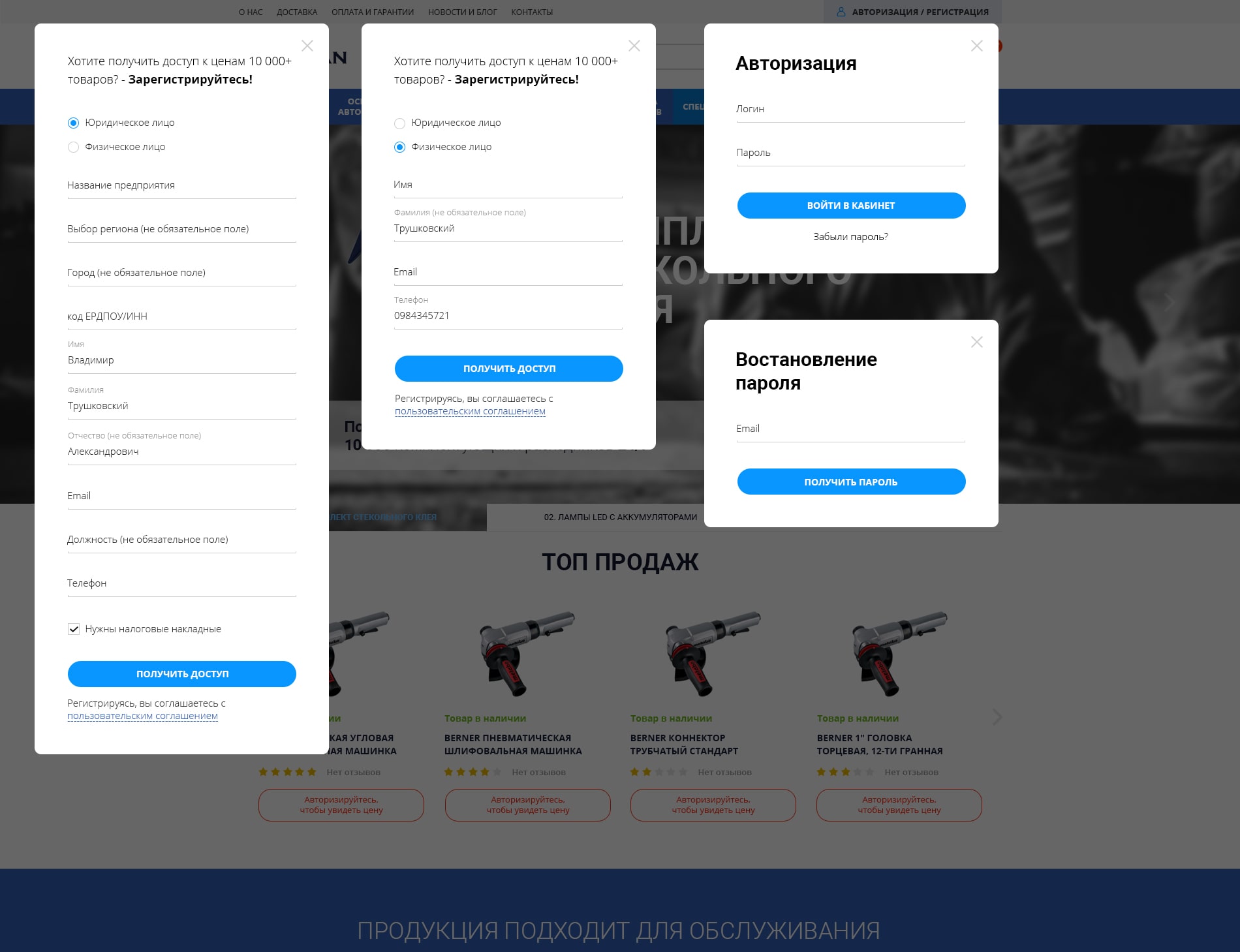 Всплывающие формы Авторизации и Регистрации, Забыли пароль, Попап доступа к ценам, мы продумали каждую мелочь, чтобы сайт сопровождал пользователя на всем пути к покупке, сделав процесс работы пользователя с сайтом максимально понятным. Необходимые подсказки и формы — уменьшают включение менеджеров клиента, в большинстве случаев подключая их только при закрытии сделок.