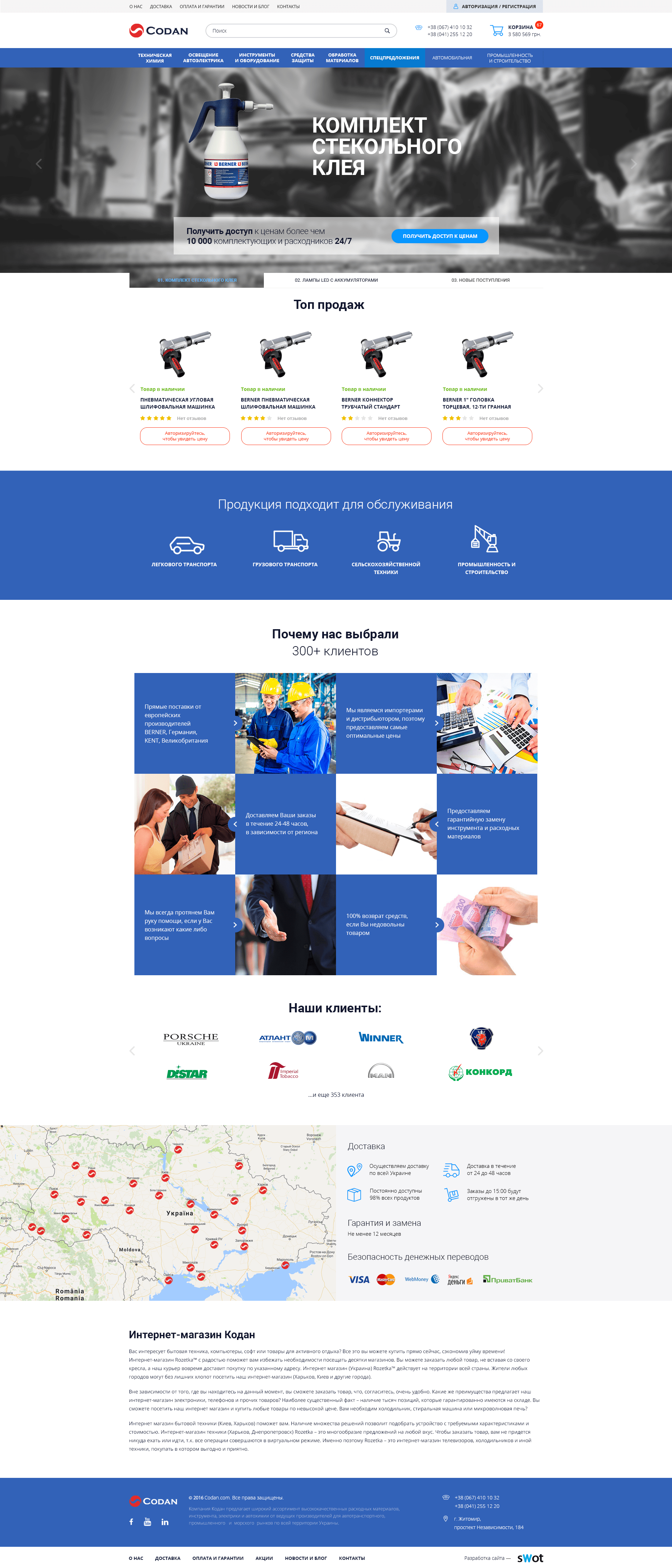 Слайдер на первом экране с баннерами для спец. предложений, также содержит «лид магнит», который повышает конверсию в регистрации. Слайдер Топ.подаж — содержит самые популярные товары. Блок «Кому подходит продукция» важен в специфических нишах, т.к. позволяет повысить релевантность, показывая что пользователь попал именно туда и решит свои задачи. Преимущества оформлены с акцентом на уникальное торговое предложение (УТП) компании, а также используют триггер опыта, через количество клиентов. Блок с логотипами клиентов усиливает прошлый, делая акцент на крупные бренды которые уже выбрали данную компанию, а также повышает трастовость, т.к. надежность бренда сайта автоматически приравнивается к именитым клиентам. Блок доставки и оплаты выведен на главную, чтобы показать работу по всей территории Украины, с акцентом на удобство и надежность доставки и оплаты, что немаловажно при оптовых закупках с большим чеком.