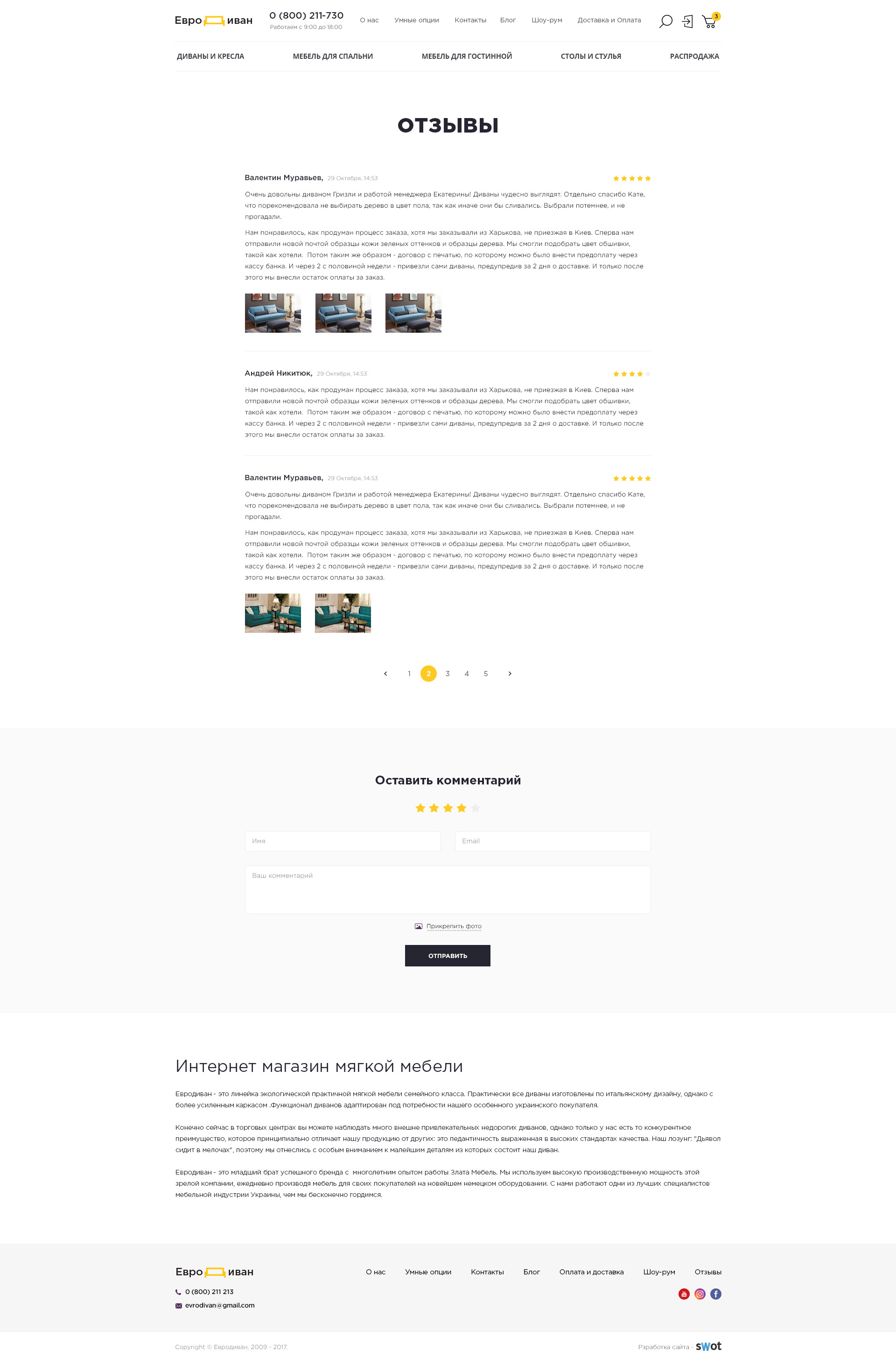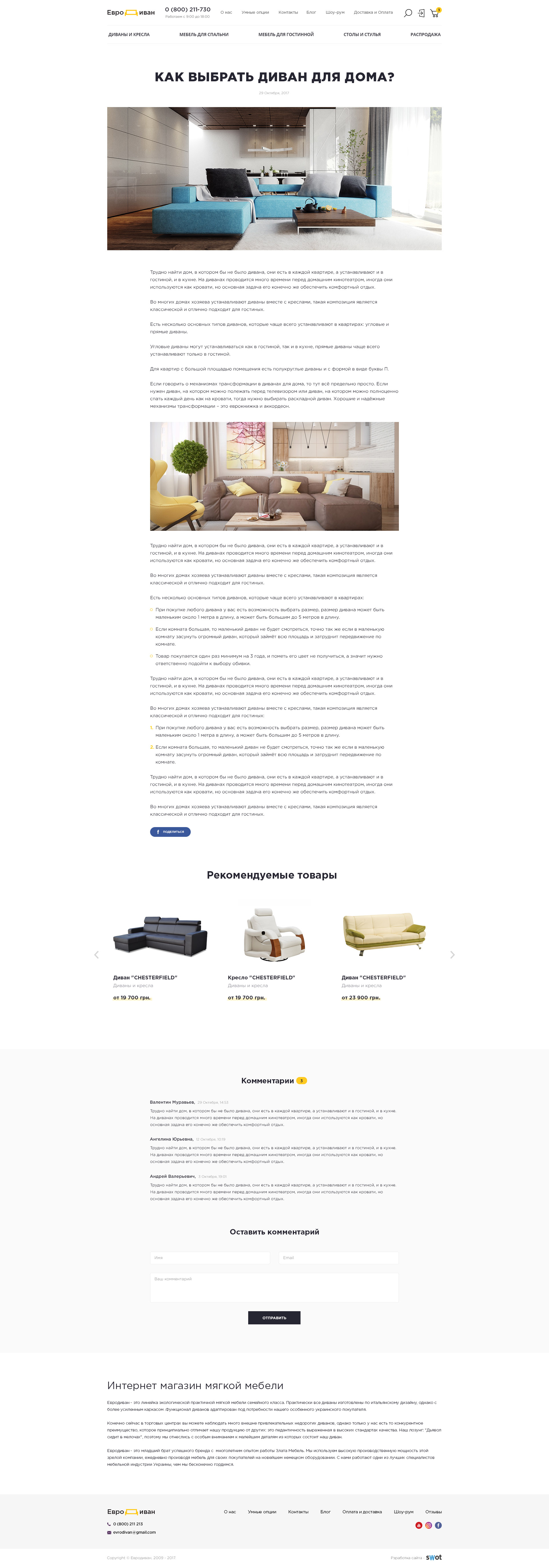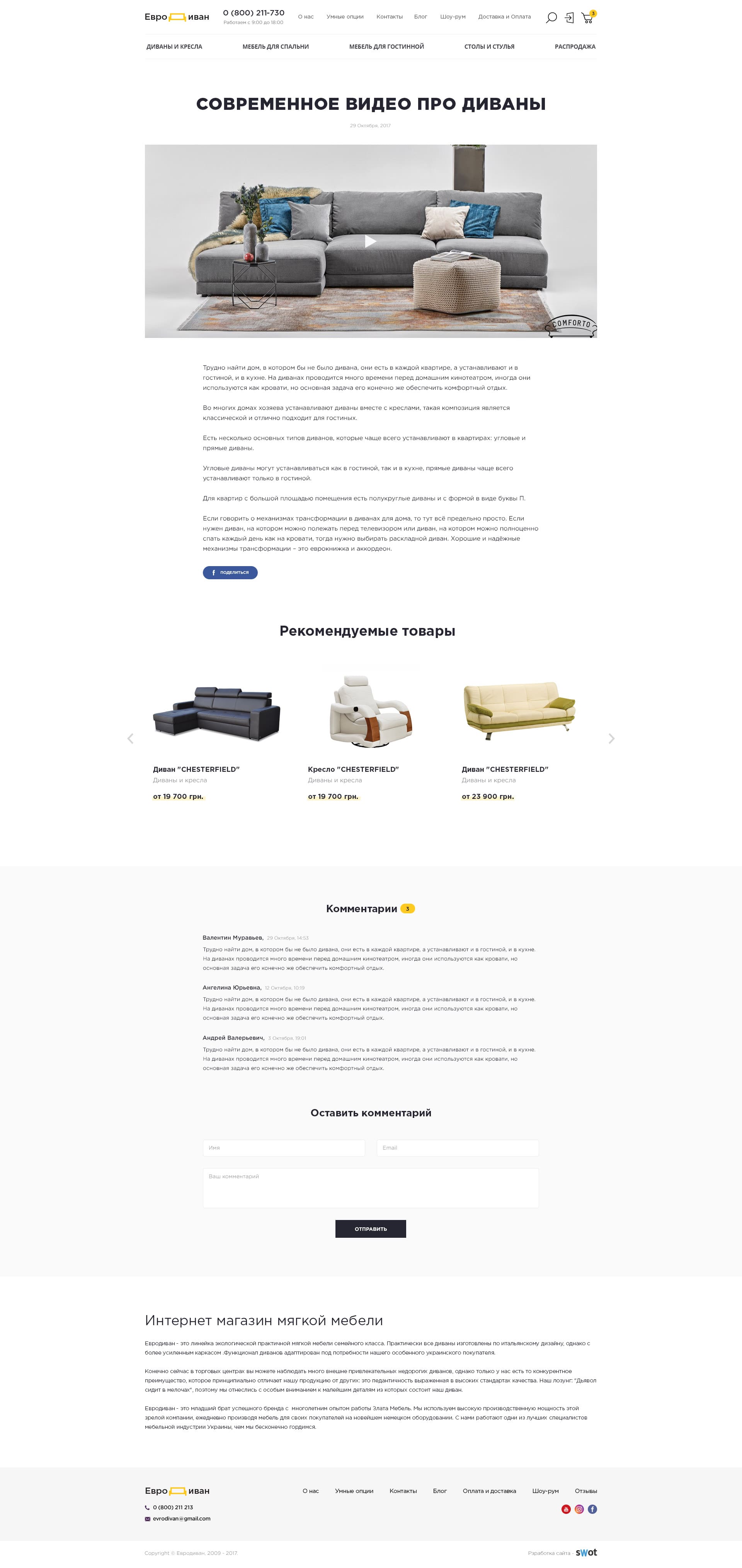 Страница товара содержит всю необходимую информацию о товаре, краткое описание и характеристики, удобный слайдер, дополнительных опциях, материалах и цветах обивки, позволяет загрузить видео-обзор. Маркетинговые блоки «Вместе дешевле», «Другие товары в коллекции» и «Сопутствующие товары» позволяют осуществить допродажу, повышая сумму заказа. А расширенный функционал комментариев (отзывов) с возможностью поставить оценку и прикрепить фото дивана в интерьере клиента является одной из «фишек» сайта.