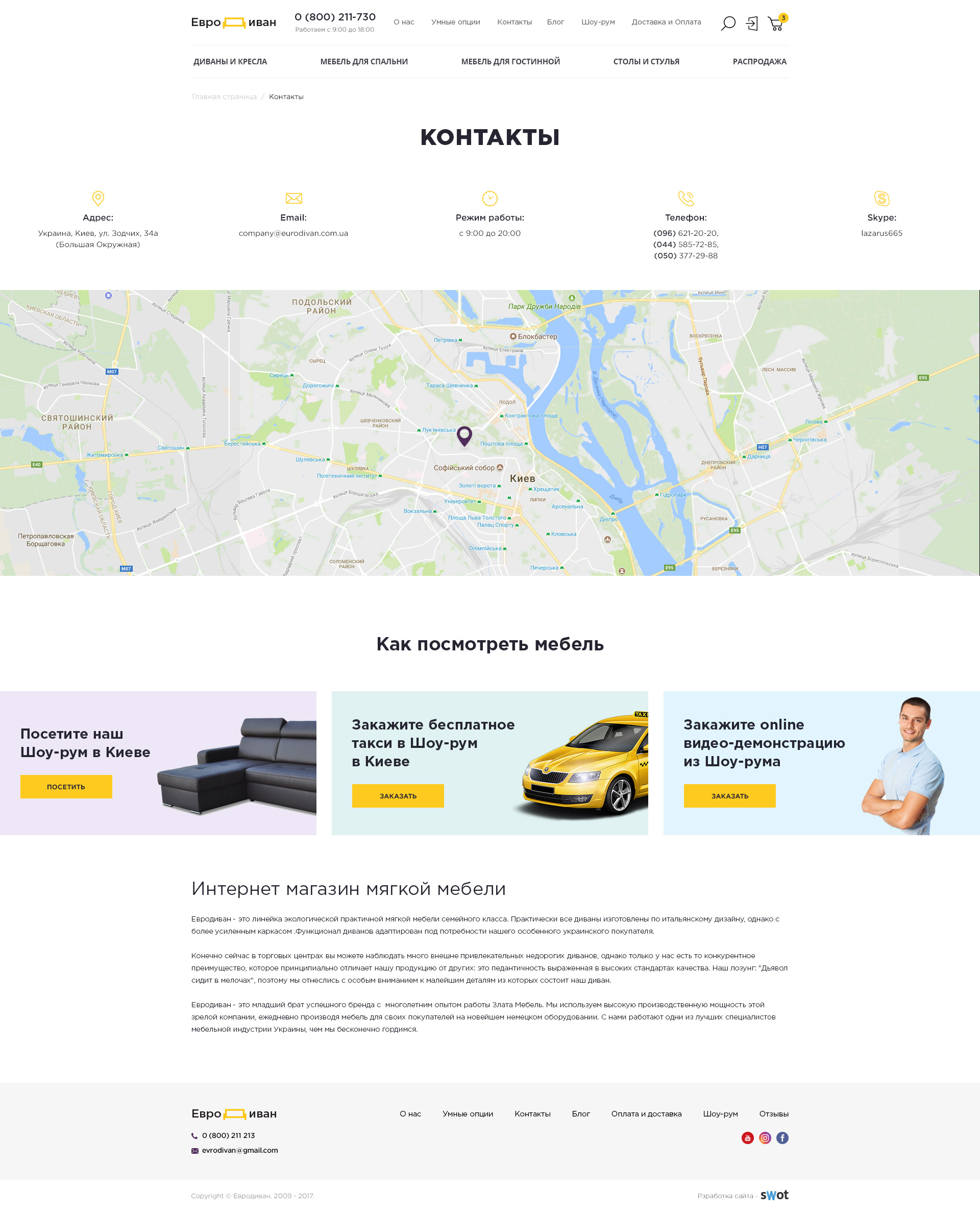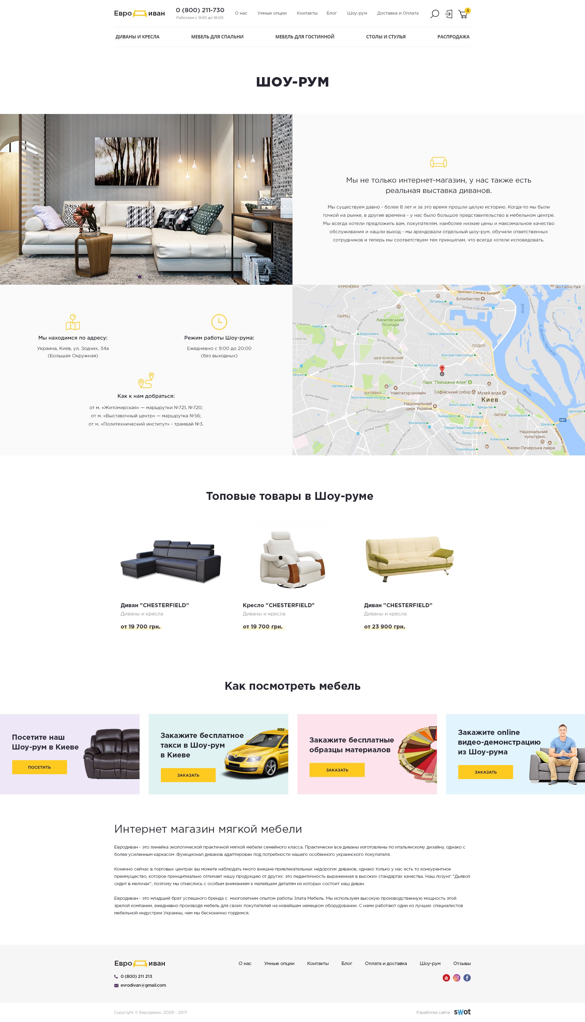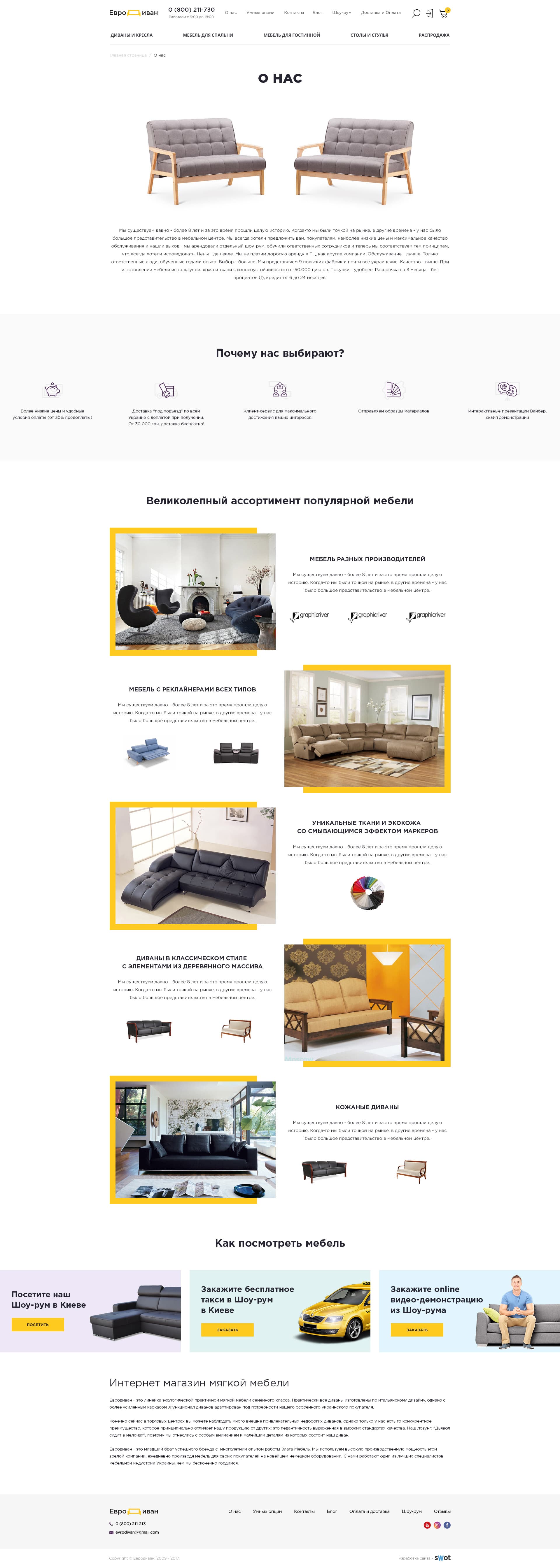 - Чтобы выделить компанию на конкурентном рынке, на основе анализа поведенческих сценариев при покупке мебели, возможностей компании и бенчмаркинга лидеров рынка в смежной нише, реализован блок «Как посмотреть мебель?». Он не просто отвечает на один из ключевых вопросов целевой аудитории, а играет роль дополнительных конверсионных действий — дает на выбор возможность: Посетить Шоу-рум, Заказать бесплатное такси в Шоу-рум или оnline видео-демонстрацию из Шоу-рума, выезд менеджера на дом или в офис или получить бесплатные образцы материалов. Выводиться на главной и практических всех страницах, работает как Лид-магнит, и призван поднять сервис компании в глазах покупателя на голову выше многих конкурентов и приблизить еще на 1 шаг к покупке.