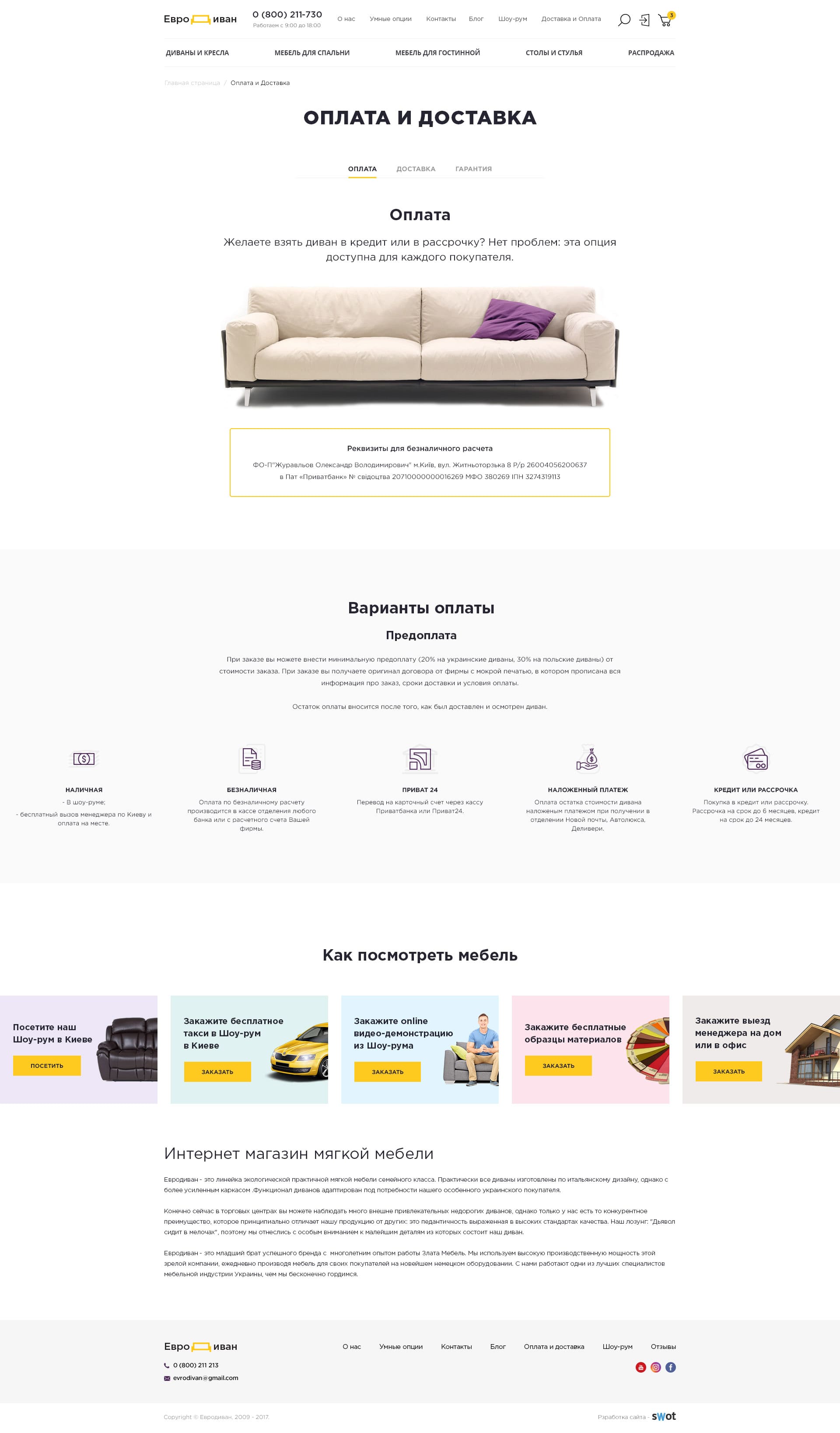 Одна страница содержит удобно оформленную для понимания пользователя информацию о способах оплаты, доставки и гарантиях.