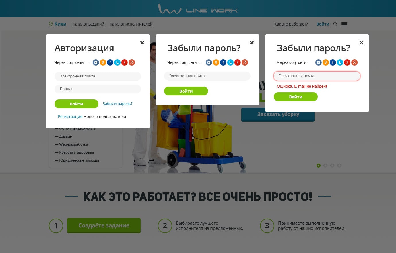 Простые попапы для быстрой регистрации, авторизации и восстановления пароля.