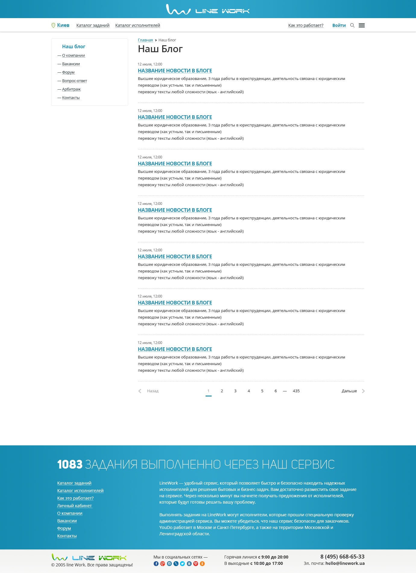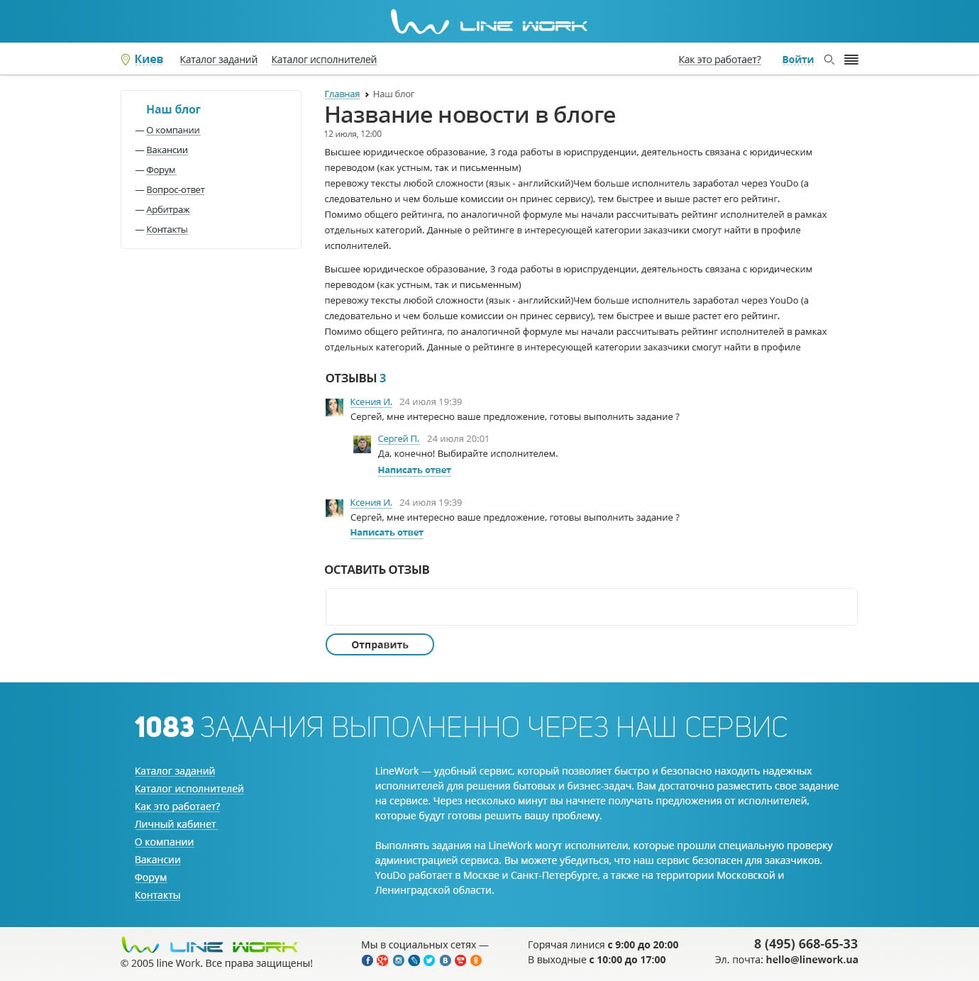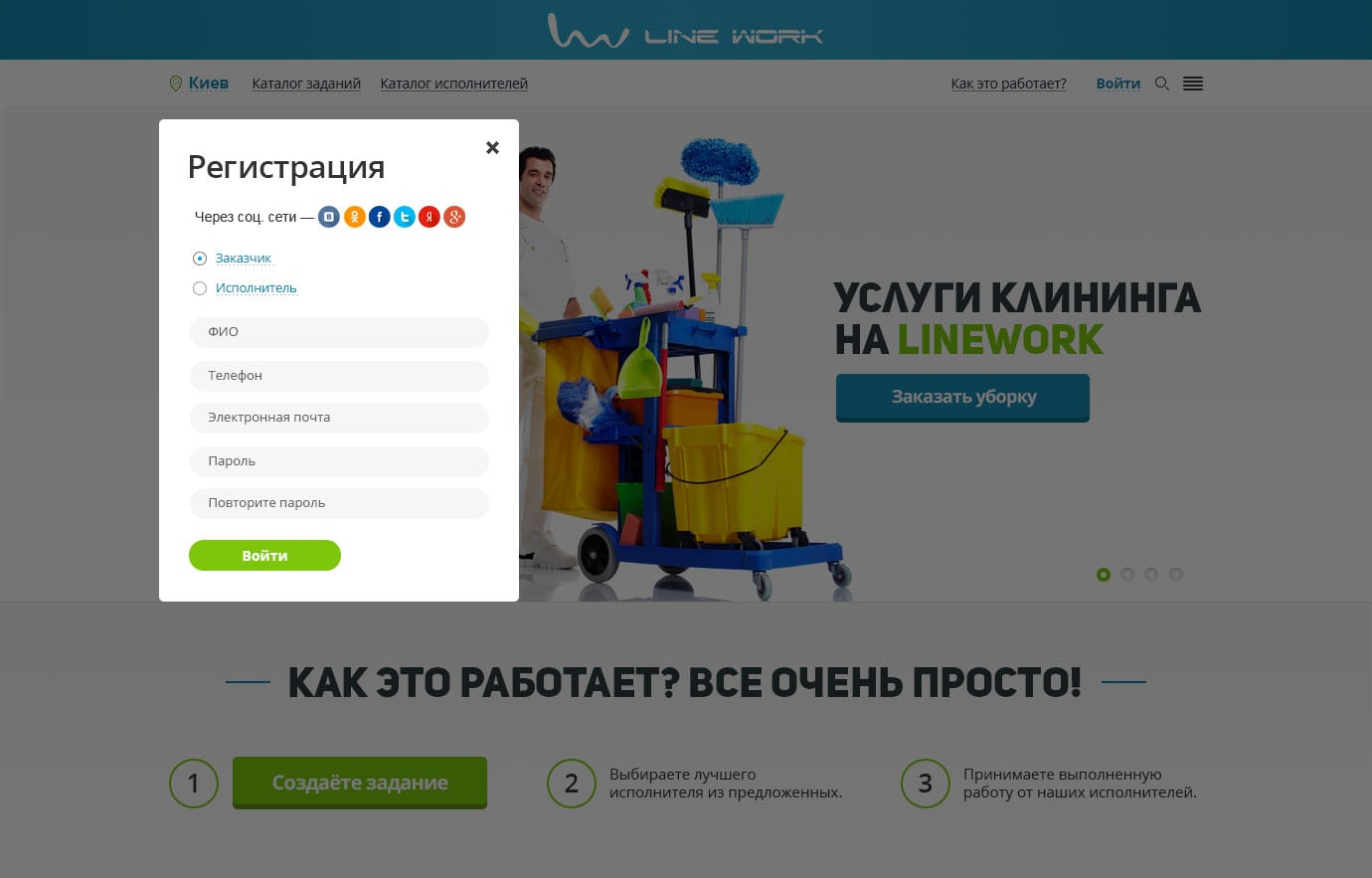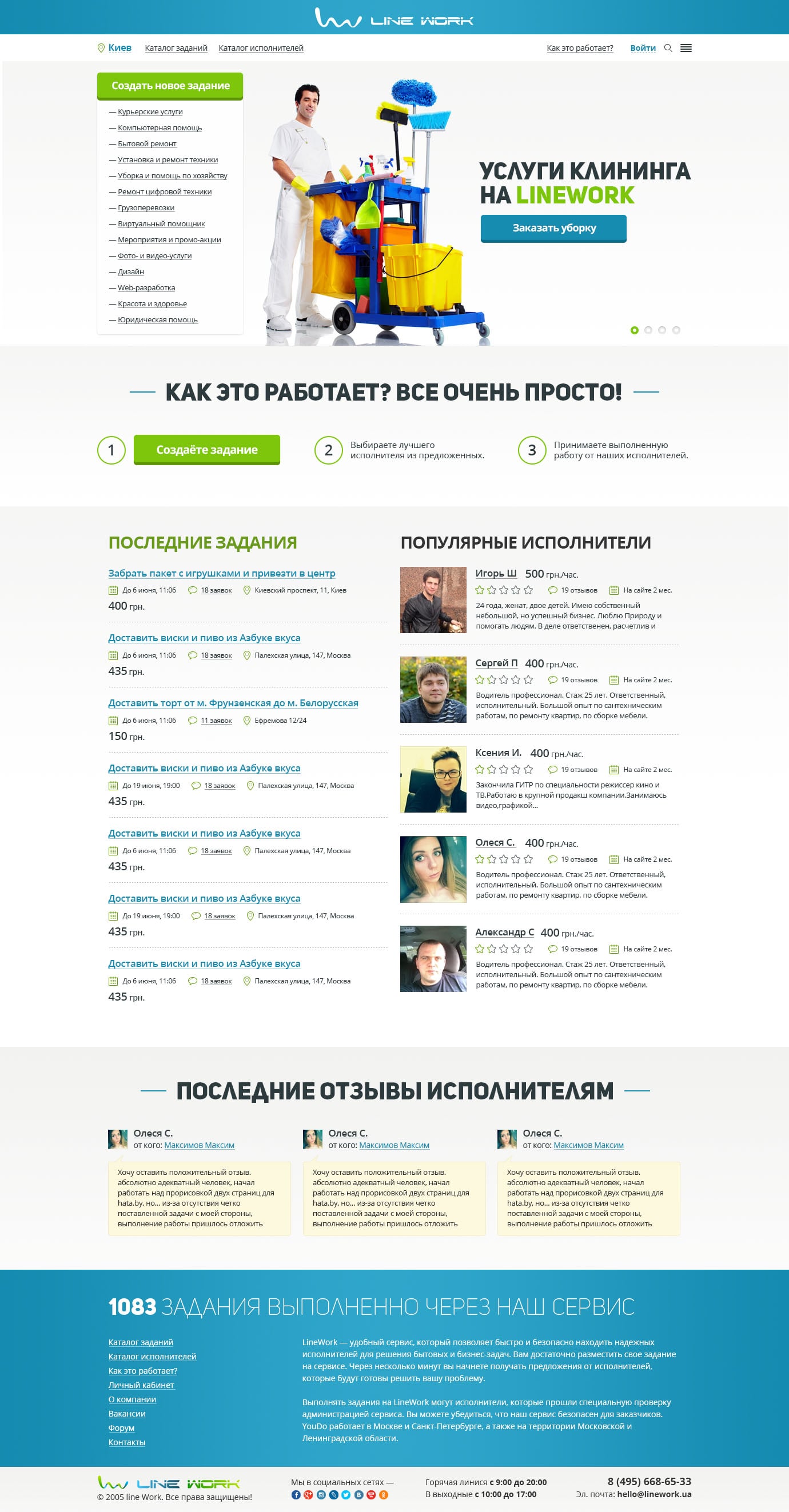 Первый экран встречает удобным и информативным слайдером с возможностью задать баннер под любую популярную категорию, а также кнопкой перехода к быстрому размещению задания. Слева для упрощения навигации оптимально размещен блок со ссылками на основные категории. Блок «Как это работает» показывает простоту сервиса. Ниже представлены блоки активностей сервиса «Последние задания», «Популярные исполнители», «Последние отзывы», которые вовлекают пользователей с первой страницы и повышают трастовость к сайту.