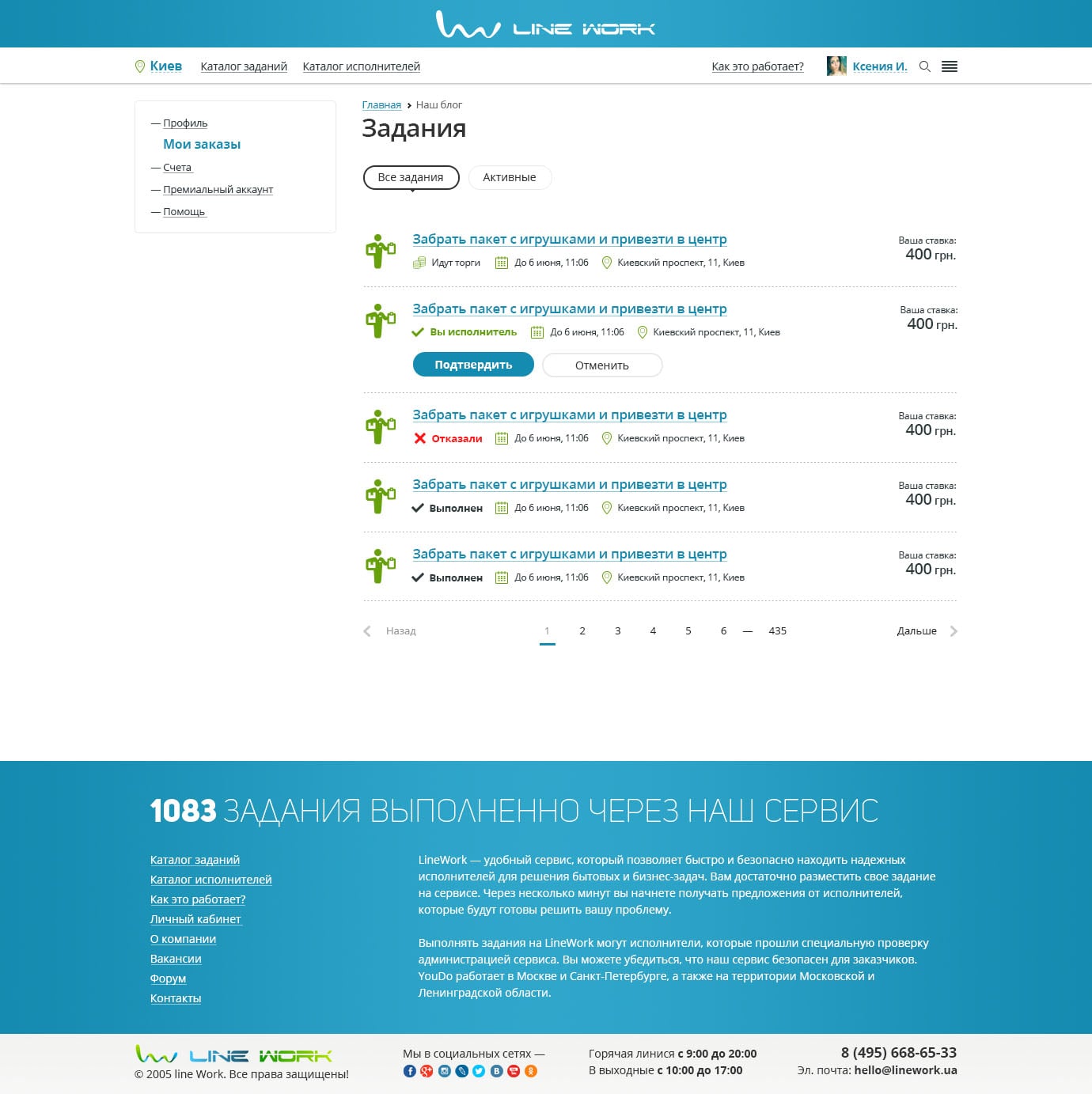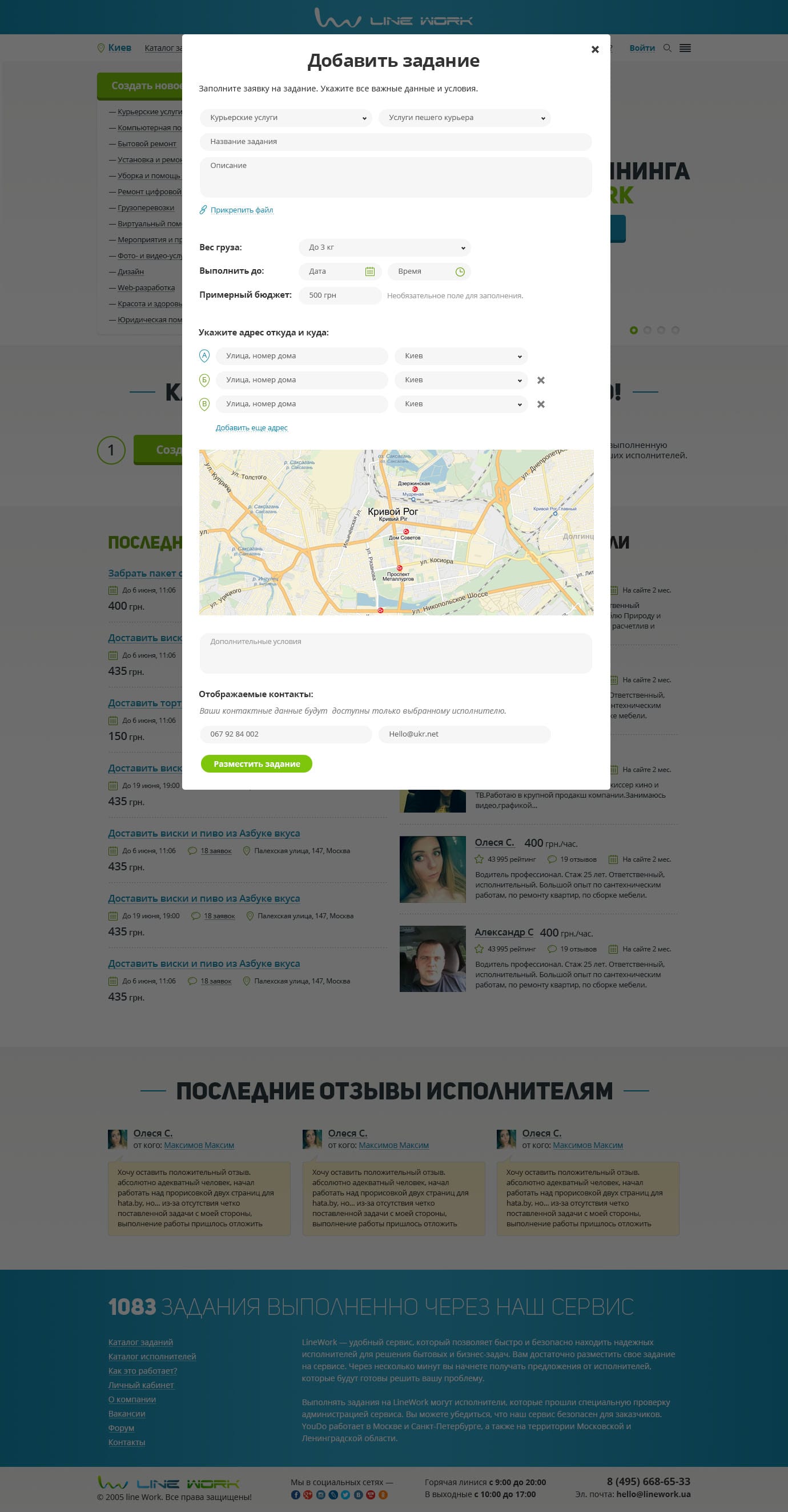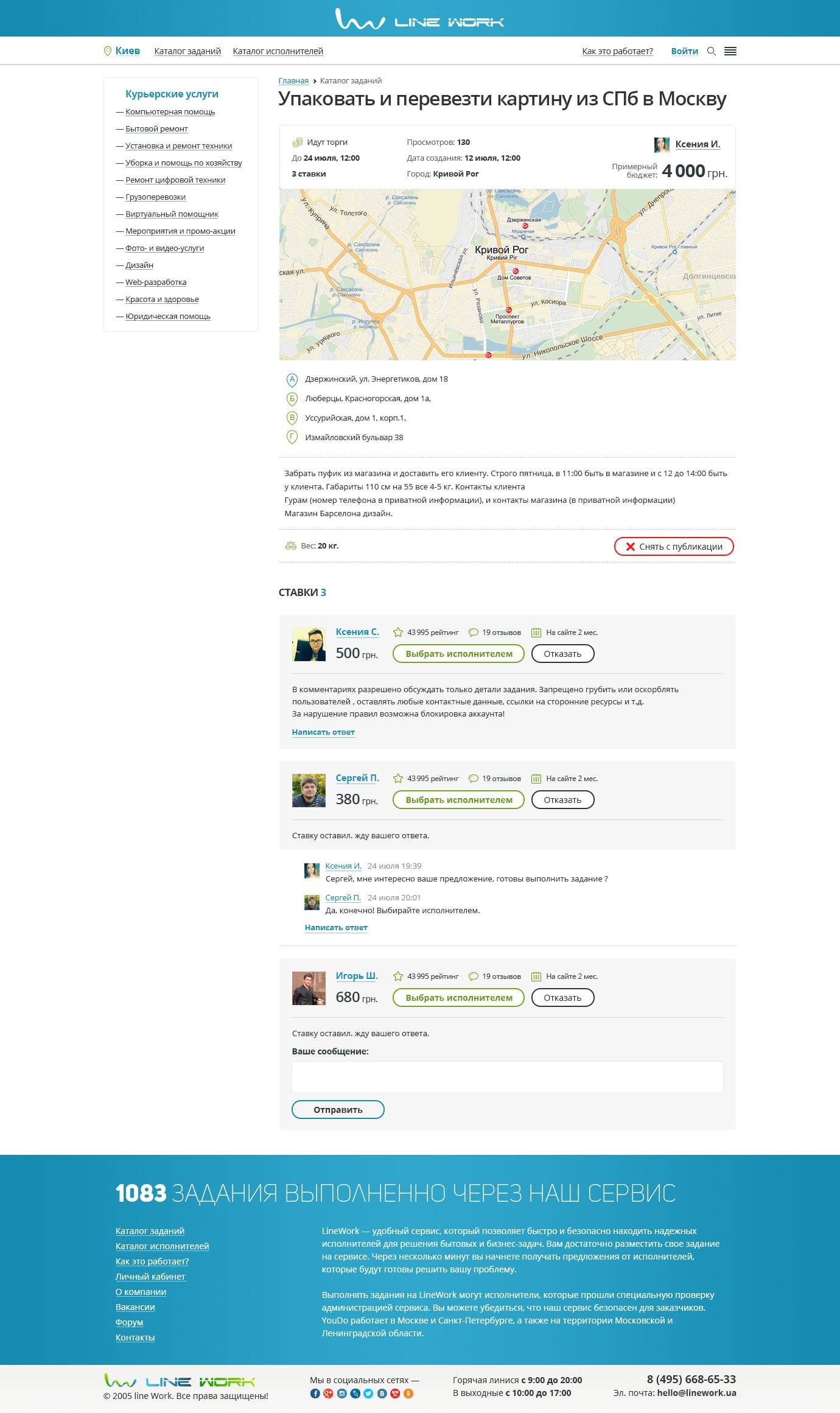 Создание задания простое и происходит во всплывающей форме. Страница задания имеет продуманный интерфейс с выводом всей необходимой для Исполнителя информации. Для категорий доставки предусмотрена возможность указать точку «А» и «Б» с интерактивным отображением на карте. А также возможность оставить ставки, т.к. выбор Исполнителя реализован по принципу биржи-фриланса.