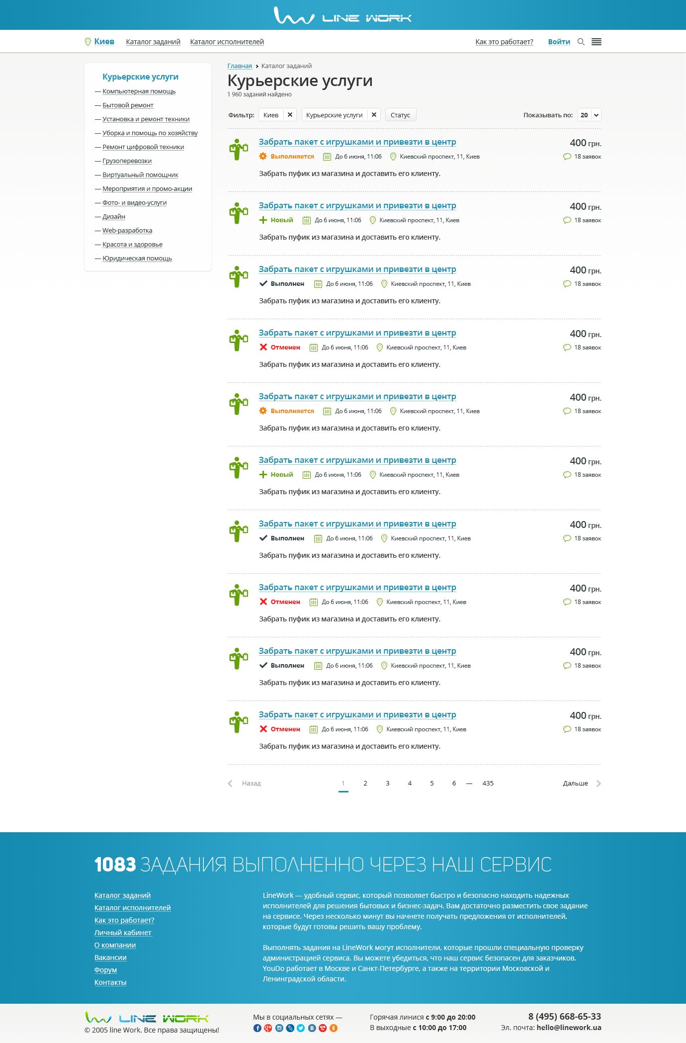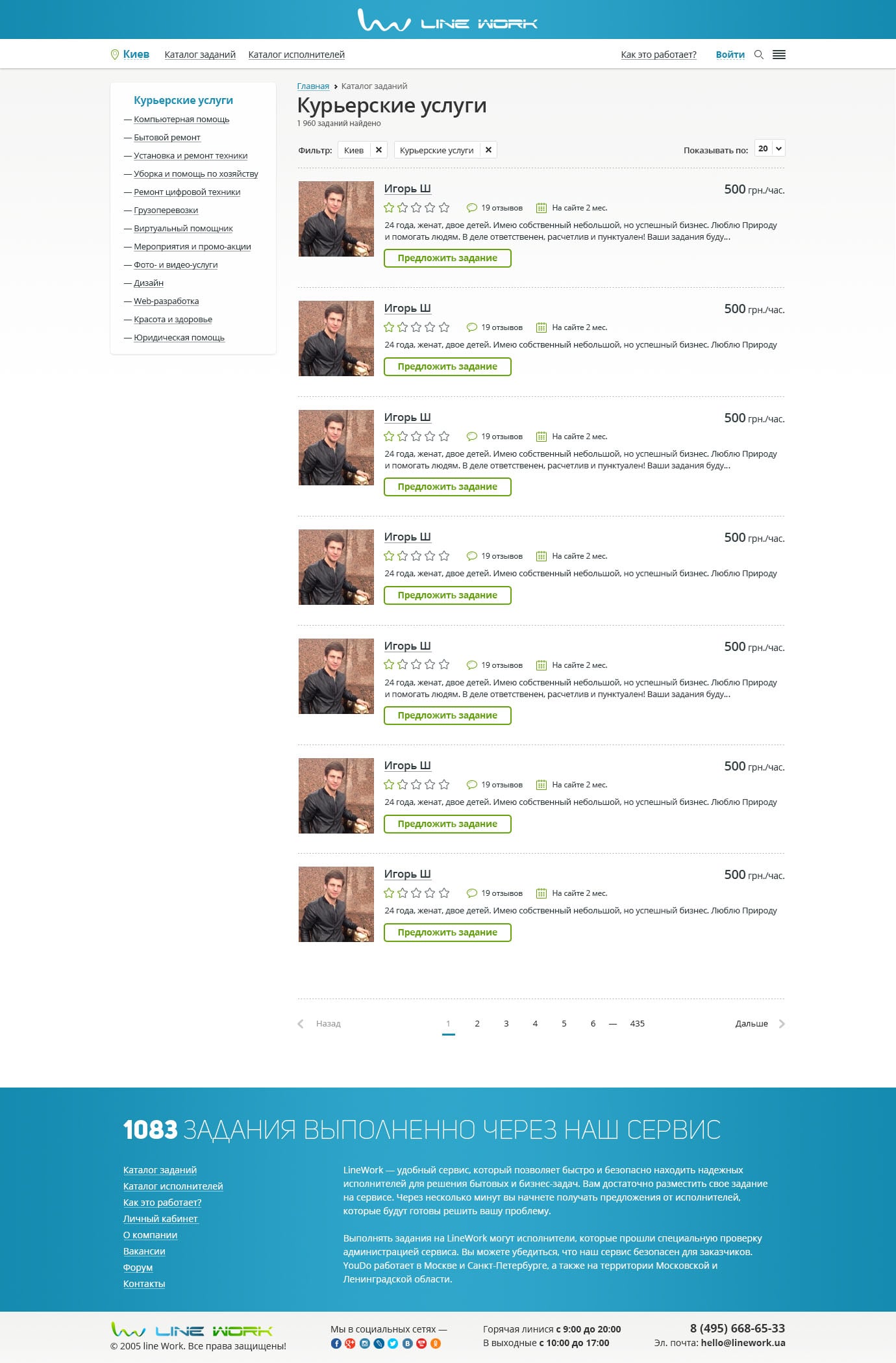 В каталоге представлено разделение на Исполнителей и Задания в категории. На странице исполнителей информативно представлены исполнители категории, с краткой информацией для понимания качества работы и опыта и возможностью предложить работу. На странице категории выводиться плитка заданий с возможностью выбора количества заданий в выдаче, сбоку расположена удобная навигация по каталогу. Плитка содержит минимальную необходимую для Исполнителя информацию по каждому заданию: название, дату публикации, предварительную стоимость, кол-во заявок и адрес при наличии, а также статус задания.