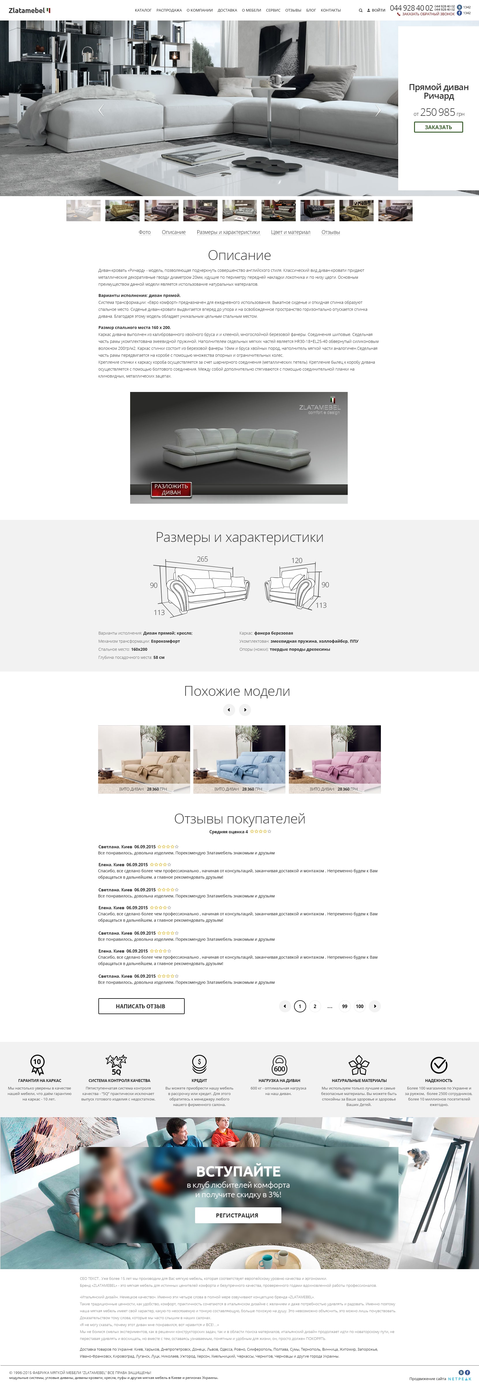Карточка встречает пользователя широкоформатным слайдером удобным для показа больших товаров — модульных диванов, являющимися «китом продаж» (на тот момент), далее цена «от» и кнопка заказа. Ниже представлены необходимые блоки с вспомогательной информации для принятия решения о покупке: описание, чертежи с размерами и хар-ками, видео-раскладки и отзывы.