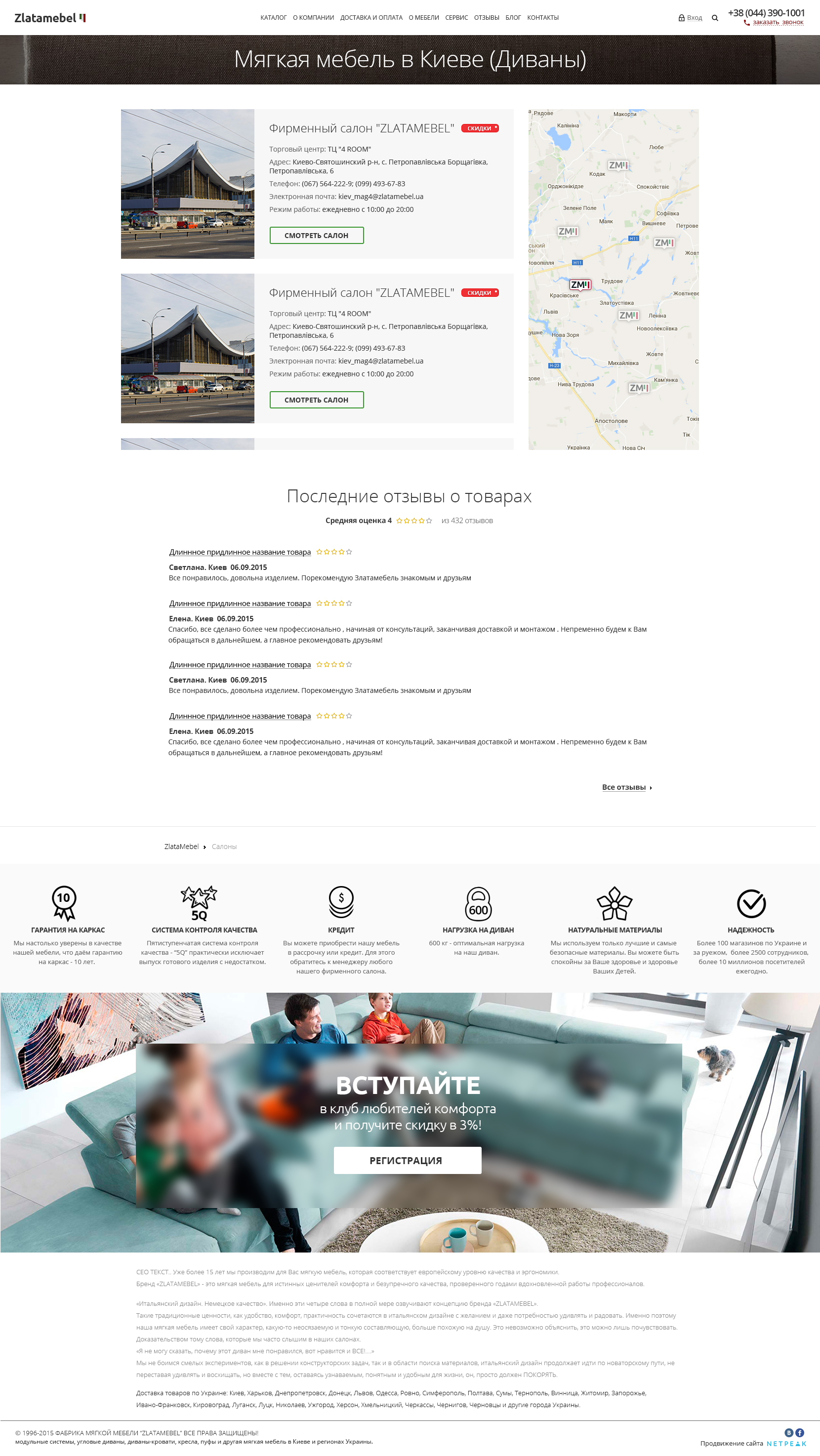 Данному разделу уделялась важная роль, поскольку для ниши мягкой мебели наличие салонов является критически выжным для продаж. Так как больший объем сбыта осущствляется через/с включением розницы, а компания имеет одну из крупнейших розничных сетей в Украине (что является важным конкурентным преимуществом), то на главной странице Контактов оставили реализацию развернутого перечня городов с интерактивной Google-картой, чтобы показать масштаб компании и ее «рыночную силу» и повысить доверие к бренду. После выбора города, пользователь попадает на страницу салонов города, где может выбрать наиболее удобный по расположению салон. На странице салона содержиться более детальная инфомрация по салону — слайдер, чтобы пользователь легче нашел салон в ТРЦ, адрес и контакты, местоположение салона на карте.